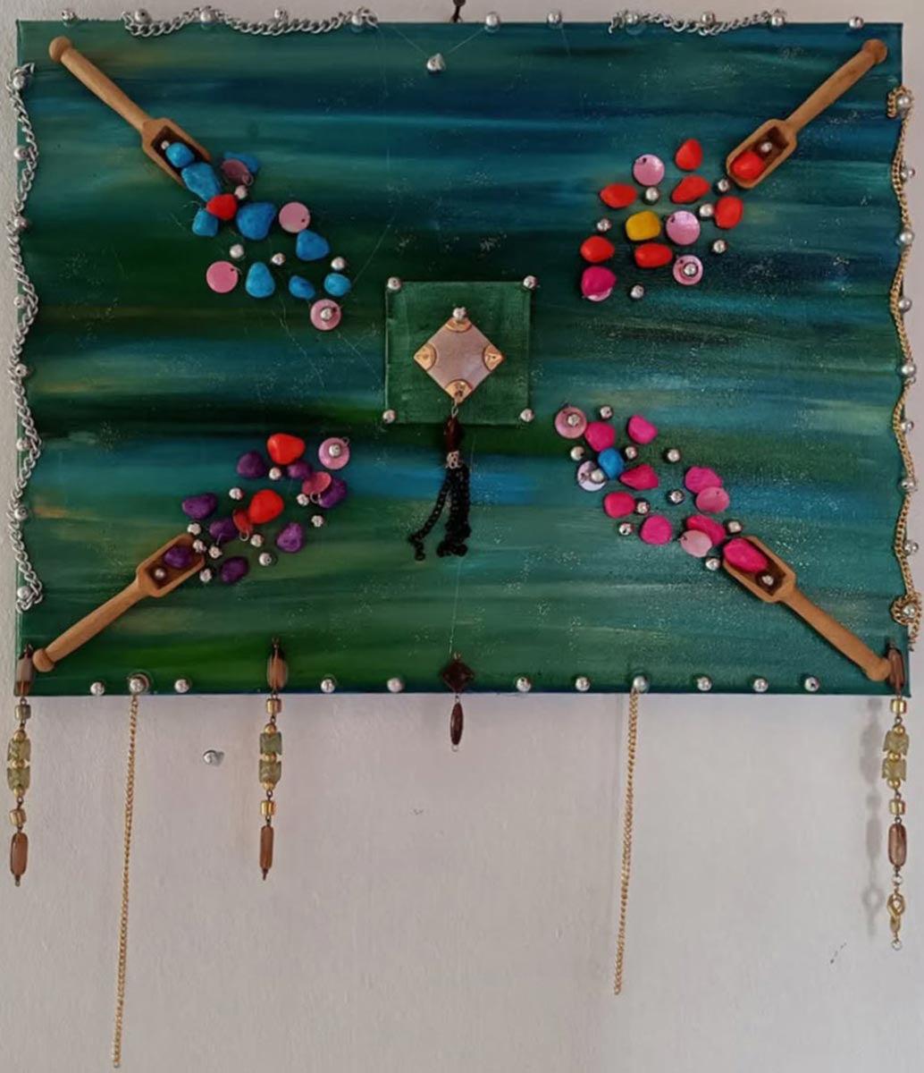 Materiali: colori a olio inutilizzati, pietre colorate, bigiotteria, cucchiaini di legno.